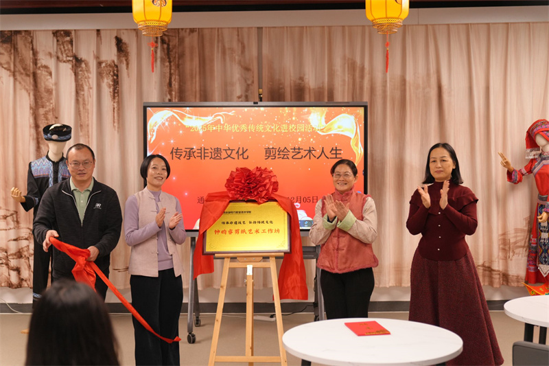 12月5日,“钟昀睿剪纸艺术工作坊”揭牌仪式在里建校区“非遗工作室”成功举行。该工作坊由广西水电职院通识教育学院与广西工艺美术大师、南宁剪纸代表性传承人钟昀睿合作共建,旨在推动中国剪纸这一非物质文化遗产的活态传承与当代创新。通识教育学院院长韦弘、副院长邓登云、钟昀睿及40名师生代表出席,仪式由邓副院长主持。