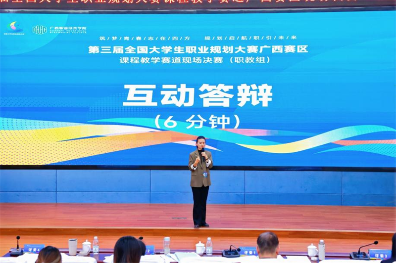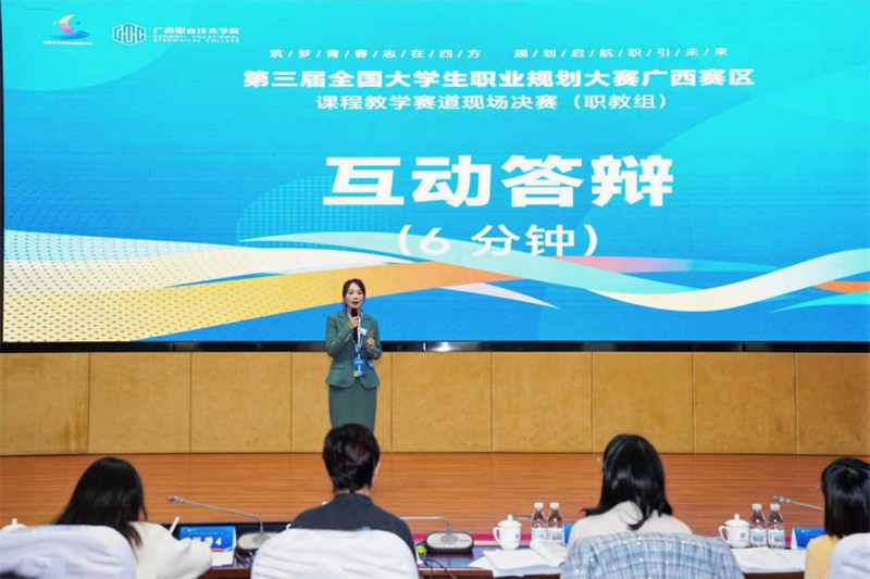本次大赛课程教学赛道省赛选拔赛分为复赛网络评审(占比60%)与现场总决赛(占比40%),共设金奖6项、银奖10项、铜奖15项。经过复赛选拔,全区20所高职院校的30名教师晋级决赛。在现场决赛中,选手围绕“课程建设汇报、教学能力展示、互动答辩”三大环节展开角逐。广西建院两位教师凭借扎实的课程建设基础和出色的现场发挥,最终脱颖而出,分获金、银奖项。