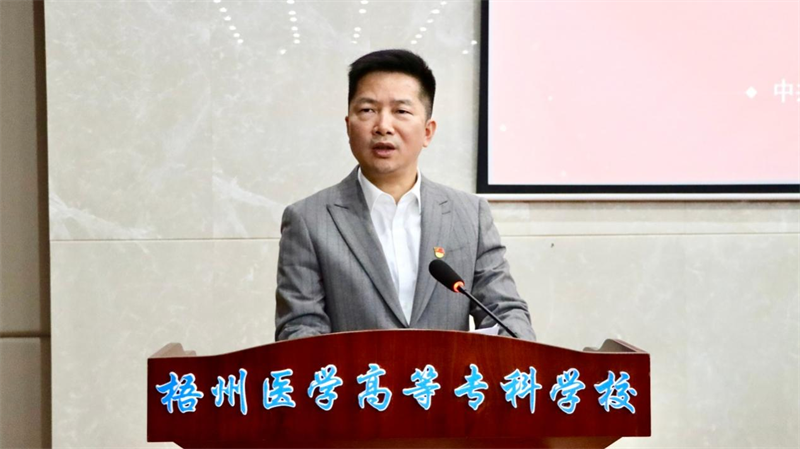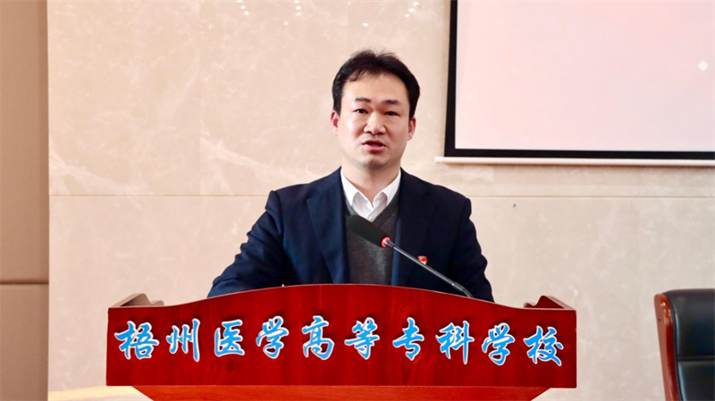 梧州市委教育工委委员、市教育局党组成员、副局长邓海华致辞,他表示,本次大会是在全面推进教育强国、教育强区建设的关键时期,学校圆满收官“十四五”规划、精心谋划“十五五”,申办职业本科专业、筹建职业本科大学关键节点召开的一次重要会议,对于学校进一步明确发展方向、凝聚发展力量、推动各项事业迈向新台阶具有至关重要的意义。梧州医学高等专科学校成立五年来,主动融入“康寿广西、健康梧州”建设,已为区域大健康产业输送“下得去、干得好、留得住”的高素质技能型医药卫生人才一万余人,超八成留桂扎根基层,用行动诠释了“办一方教育、育一方人才”的担当。