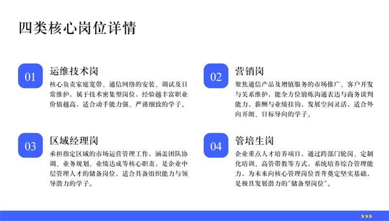 结合企业发展规划与学校专业特色,此次合作首批开放四大类核心岗位,覆盖技术、营销、管理等多个发展方向,为不同特质的学子提供精准适配的职业路径: