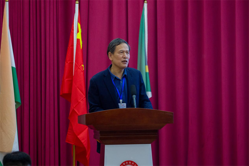 蹇兴超在致辞中表示,大赛不仅是技艺的比拼,更是智慧的碰撞与友谊的桥梁。他强调,南宁职业技术大学始终秉持“服务区域、对接产业、融合国际”的办学导向,承办此次国际大赛是对学校办学实力的一次全面检验,也是学校深化“岗课赛证”综合育人、服务“一带一路”建设与金砖国家技能合作的重要实践。