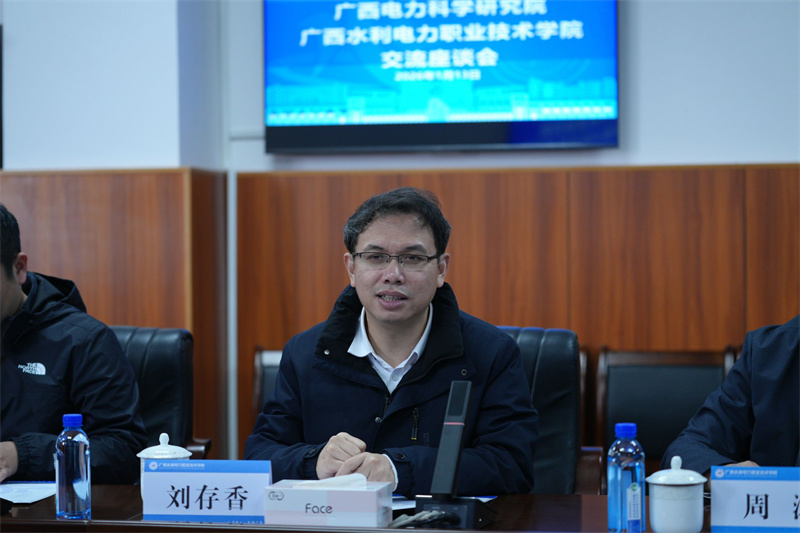 座谈会上,刘存香对广西电网有限责任公司电力科学研究院的到访表示热烈欢迎。他介绍了学校的整体科研情况和目前学校高质量发展过程中面临的瓶颈,希望双方围绕电力实训场升级改造等内容,充分利用电科院的高精尖设备和新技术,共同开展科研合作,并依托学校职教“出海”载体,探索电力技术输出的有效途径。