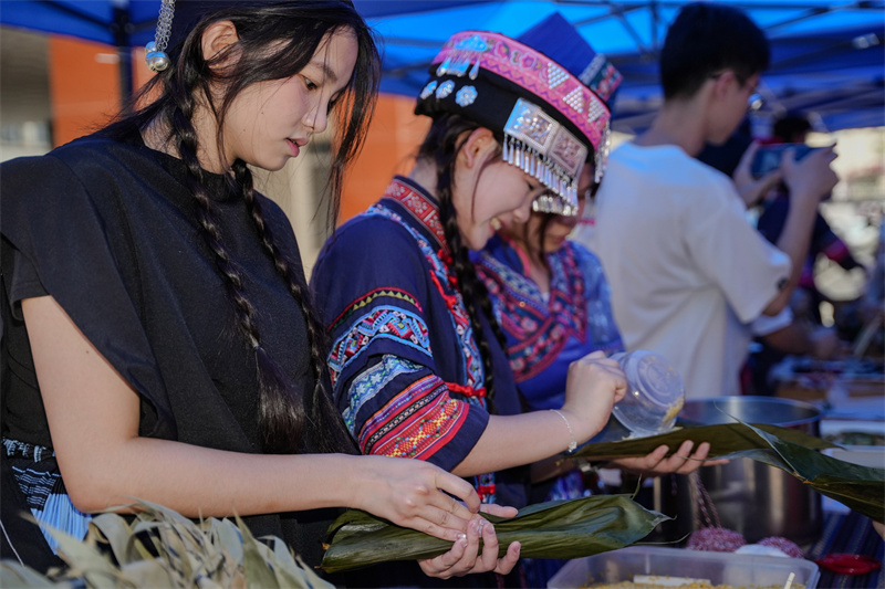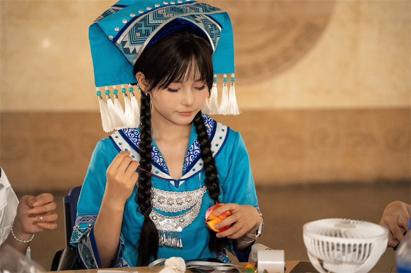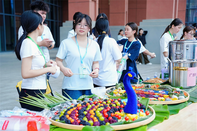 活动现场,山歌对唱环节气氛热烈,师生以歌传情、以歌会友,用青春嗓音唱响民族风情,传递民族团结正能量。民族服饰体验区内,壮、苗、瑶等多民族传统服饰吸引师生试穿打卡,尽显多彩民族风采。非遗手工坊中,绣球 DIY、掐丝珐琅、漆扇制作等项目有序开展,大家在手把手创作中感受非遗技艺的独特魅力,让传统文化在校园薪火相传。