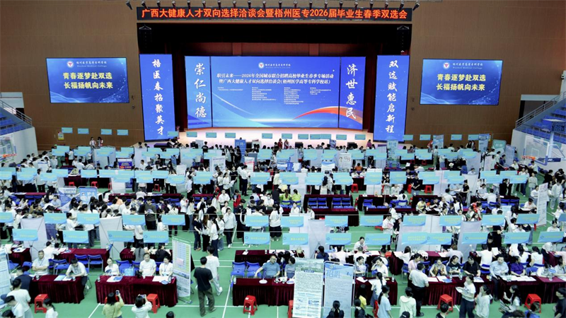 4月15日,由自治区人力资源和社会保障厅主办的“2026年全国城市联合招聘高校毕业生春季专场活动暨广西大健康人才双向选择洽谈会梧州医学高等专科学校站”在该校蔚蓝体育馆举行。双选会吸引了区内外348家医疗卫生机构、医药企业、康养行业等优质单位参会,提供就业岗位超一万个,梧州医专及其他院校毕业生超6000人入场求职,现场达成初步就业意向近3000人次。