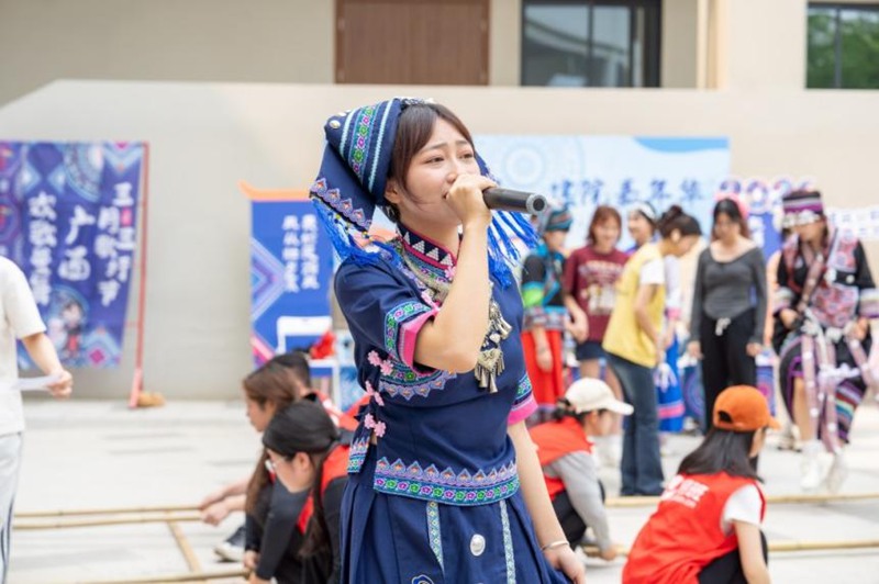 以歌会友,霓裳展韵绘就多彩民族风。 活动在热闹的舞狮表演中拉开帷幕。身着壮族、苗族、瑶族等传统服饰的学生们在入口处跳起竹竿舞,清脆的竹竿敲击声伴着欢快节奏,邀请到场师生共同参与。校园歌手领唱《山歌好比春江水》《大地飞歌》等经典曲目,引得师生驻足喝彩。30余套民族服饰在学生们的演绎下依次亮相,展现着广西各民族文化的独特魅力。