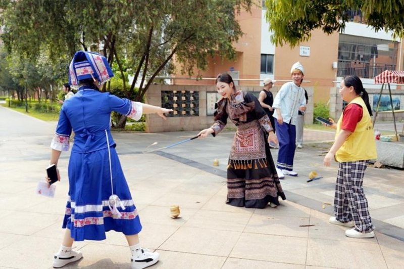 以赛传情,体育竞技点燃民族体育炫。 “绣球传情”团队默契配合,背篓接球、抛掷绣球;“板鞋竞速”赛道上,三人同穿一副板鞋,在竞技中体会团结协作;“陀螺飞旋”接力赛中,一分钟不停旋转的目标考验着每支队伍的技巧与耐心。民族体育项目将传统游戏与现代竞技融合,师生们在挥洒汗水中感受民族体育的魅力。