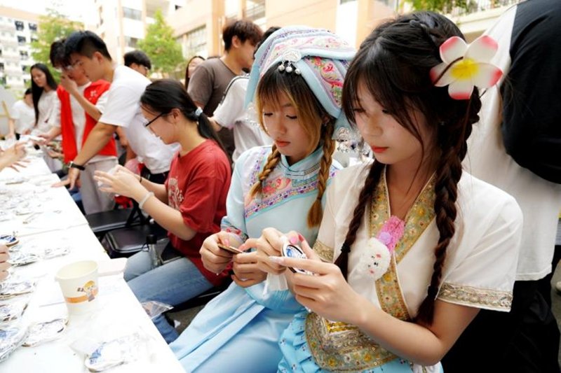 以手传心,非遗手作赓续文化根脉。 在民族非遗手工体验区,壮锦冰箱贴、手工黏土、植物染料等DIY材料包一字排开,同学们围坐桌前亲手制作,每一件作品都凝聚着对民族文化的理解。