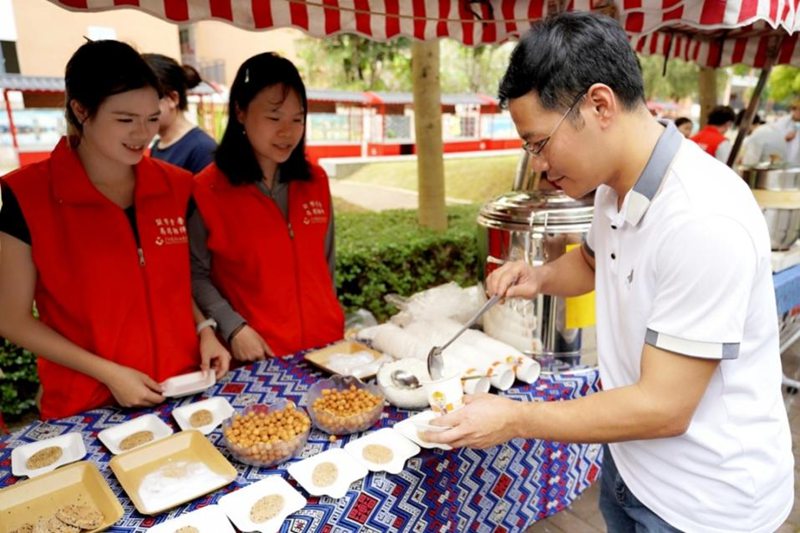 以味留客,美食品鉴留住八桂记忆。 用枫叶、黄姜等植物染制的五彩糯米散发着天然清香;清香的艾叶糍粑让师生品味春天的味道;现场熬制的油茶热气腾腾,师生们在品尝中体验待客之道。“第一次喝油茶,味道很特别,五色糯米饭不仅好看,还有淡淡的植物清香。”土木学院的卢同学分享道。