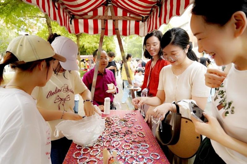 以创赋能,创意集市激发青春活力。面向全校招募的创意集市摊位前人头攒动,手工拼豆、原创插画、闲置书籍、手工饰品等琳琅满目。学生们现场交流自己的创业心得。来自市政与交通院的陶同学说:“谢谢学校能够为我们提供创业的平台,让我们锻炼自己的实践能力。作为建院的学生,我们也很幸福。”