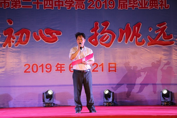 本次毕业典礼在学校舞蹈社团的激情热舞与祝福声中拉开了帷幕。庄严的唱国歌仪式后,黄伟强校长发表了《不忘初心·扬帆起航》主题致辞。黄伟强校长对高2019届学子顺利毕业表示衷心祝贺,并对即将走出二十四中校门的学子提出三点期望:一是不忘初心,心中有理想,要把个人的追求与目标融入国家与社会的发展;二是不忘初心,心中有感恩,做一个正直、善良、懂得感恩的人;三是不忘初心,心中有阳光,要用积极健康的阳光心态勇敢面对困难与挫折。