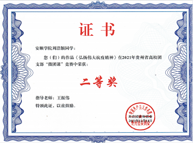 近日,共青团贵州省委公布《关于2021年贵州省高校团支部“微团课”竞赛获奖结果的通报》,安顺学院学生取得2个二等奖、1个优秀奖的优异成绩。