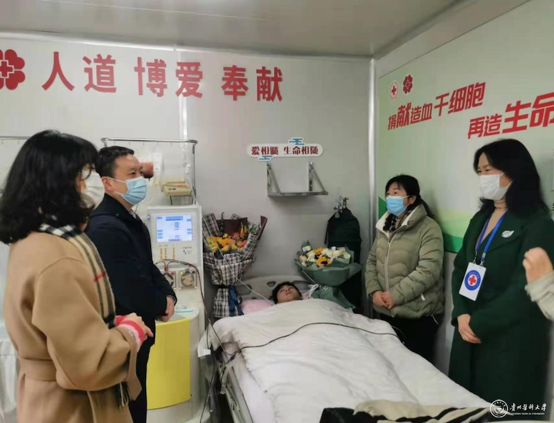 贵州医科大学党委副书记汤磊、贵州省红十字会造血干细胞管理中心主任黄凤云、团委书记肖绚、生物与工程学院党委书记封韬等人在第一时间到医院看望了向阳同学,表达了关心和慰问。汤磊充分肯定了向阳同学的爱心和善举,称赞他的博爱奉献不仅挽救了一个家庭,也是每一位青年学生学习的榜样,并叮嘱他捐献结束后要注意休息,保重身体。