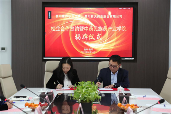 冉江舟与董大伦共同为贵阳康养职业大学-新天药业中药民族药产业学院揭牌。杨静与董大伦签署贵阳康养职业大学-贵阳新天药业股份有限公司共建产业学院协议。