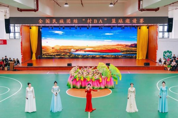 6月29日,两校师生在全国民族团结“村BA”篮球邀请赛决赛赛场上表演歌伴舞《我的祖国》(领唱为华东师范大学石春轩子教授)