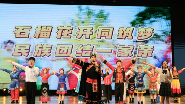 在“黔山之畔月满云漫”篇章中,青马宣讲团带来的艺术式朗诵《我在一颗石榴里看见了我的祖国》,以诗意的语言勾勒出了各民族如同石榴籽般紧紧相依的生动画面;苗族舞蹈《弥渡山歌》以翩跹的步伐和风姿绰约的姿态,展现了苗族文化的淳朴本质与热烈情感;独特的《精彩配音秀》,引领观众沉浸于声音与语言完美交融的奇幻。