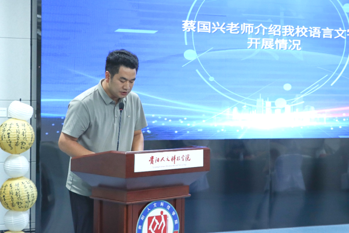 校语委办公室主任蔡国兴汇报了学校推普工作开展情况,迄今贵阳人文科技学院累计举办推普活动200余场,覆盖师生5万余人次,下一步将进一步加强推普工作与乡村振兴的融合。