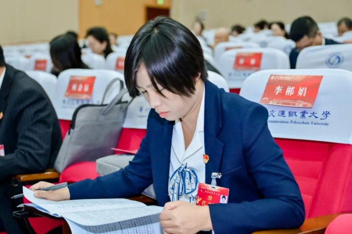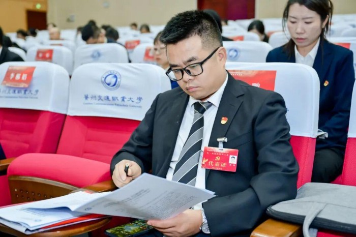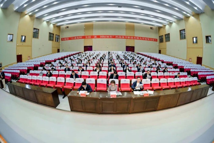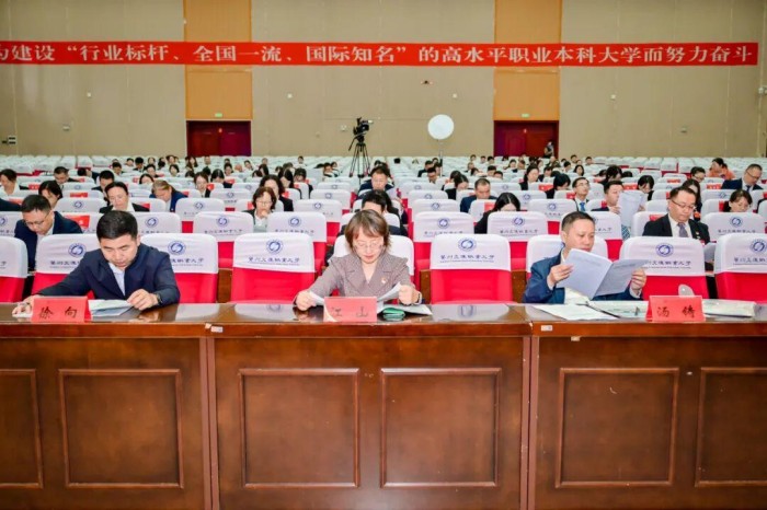 今天的大会气氛热烈,大会主席台正中悬挂着由鲜艳的红旗簇拥着的中国共产党党徽,会场悬挂着“为建设‘行业标杆、全国一流、国际知名’的高水平职业本科大学而努力奋斗”横幅。党徽熠熠生辉,红旗鲜艳似火,会场庄严肃穆。
