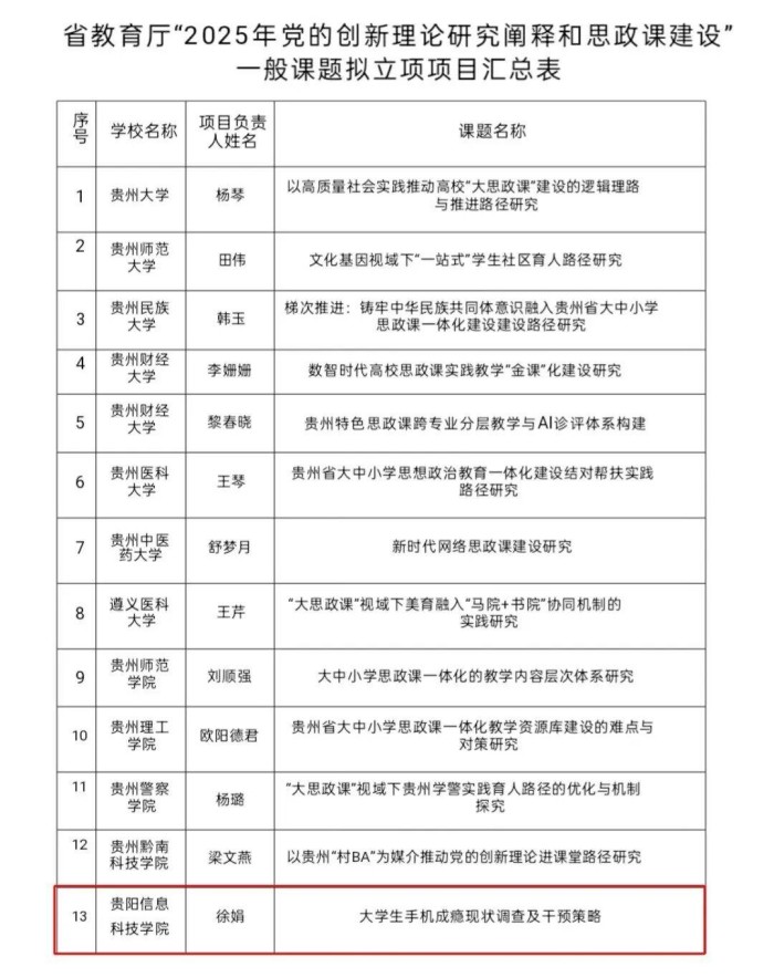 本次拟立项课题覆盖党的创新理论阐释、思政课教学改革、实践育人模式构建等重点方向。其中,贵阳信息科技学院健康管理学院徐娟老师申报的《大学生手机成瘾现状调查及干预策略》入选一般课题拟立项名单。该课题聚焦当前大学生成长过程中的现实问题,通过深入调研与对策探讨,为推动思政教育与学生管理深度融合提供了有益探索。另有罗一檾等10位老师的课题入选自筹课题拟立项名单,展现了贵阳信息科技学院教师在思政研究领域的广泛参与和深厚潜力。