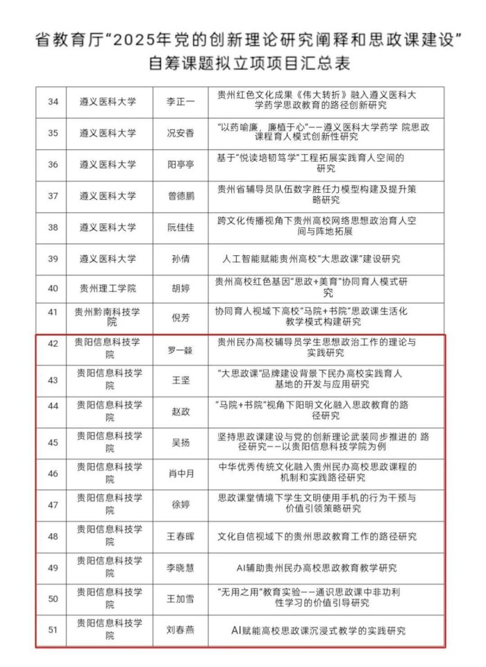 近日,省教育厅对“2025年党的创新理论研究阐释和思政课建设”课题拟立项名单进行公示,贵阳信息科技学院共有11项课题成功入选,在立项数量与质量上实现双提升,彰显了贵阳信息科技学院在“马院+书院”协同育人机制下“大思政课”建设初显成效。