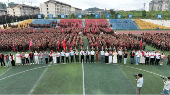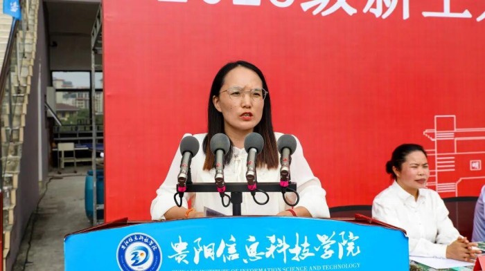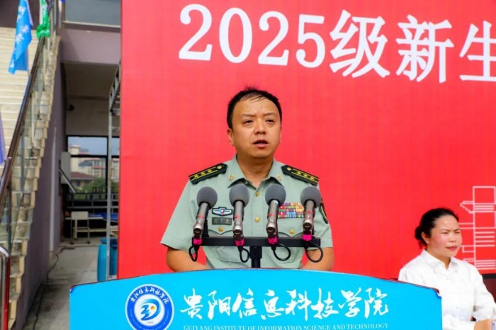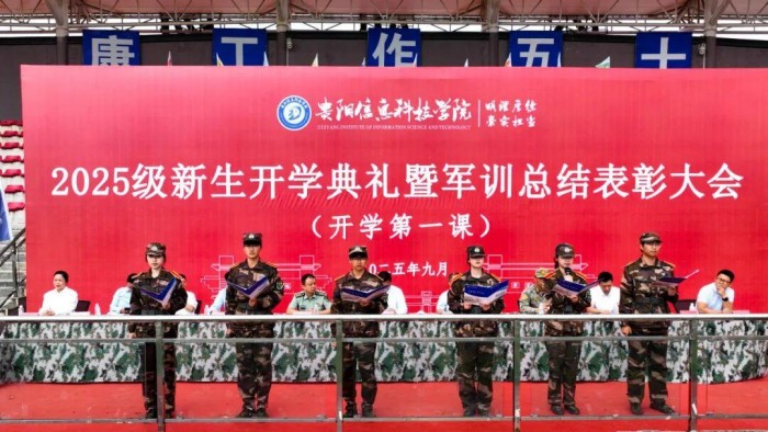 金秋时节,硕果盈枝。9月21日上午,贵阳信息科技学院在运动场举行2025级新生开学典礼暨军训总结表彰大会(开学第一课)。省教育厅(省委教育工委)民办高校党组织书记、学校党委书记邓维实出席并讲话,校长唐建荣致辞,南明区人武部上校部长王子规,承训部队带队干部,党委副书记詹凯,常务副校长余图军,副校长罗卫东,财务总监周文娟,纪委书记黄晓儒,校长助理、数字传媒学院院长李锐锋,党委委员、经济管理学院院长曹彩霞等领导出席大会,学校各处(室、部门、中心)负责人、各二级学院党政负责人,所有新生辅导员以及2025级全体新生共计4000余人参加此次大会。