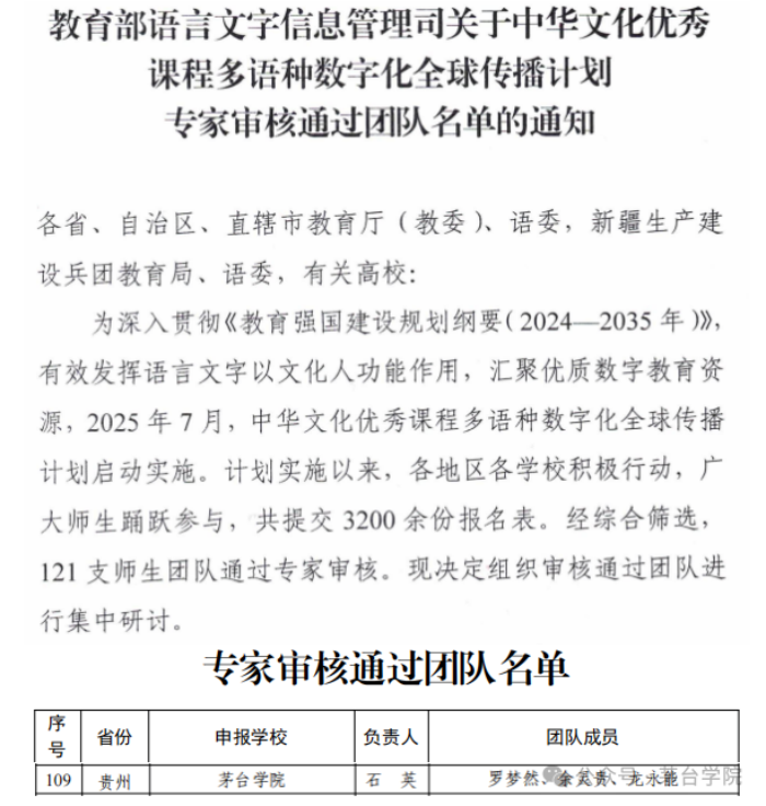 茅台学院课程团队成功入选中华文化优秀课程多语种数字化全球传播计划