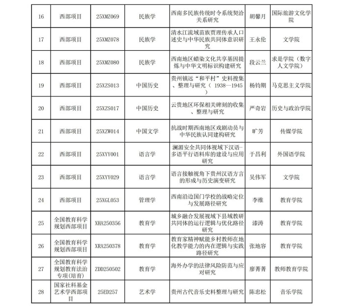 9月29日,2025年国家社科基金年度项目立项结果公布,贵州师范大学共获批24项,包括重点项目2项(贵州省获批4项),一般项目1项,青年项目5项,西部项目16项。其中西部项目立项数为历年最高,占贵州省西部项目立项数的三分之一强,与四川大学并列全国第一,说明贵州师范大学哲学社会科学研究立足西部、面向全国进行有组织科研取得突出成效,在西部人文社科领域形成显著影响。截至目前,学校已获批国家社科基金项目28项(前期已获批国家社科基金教育学项目3项、艺术学项目1项),为校史第二好成绩。