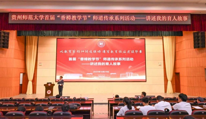10月10日下午,贵州师范大学在东区会议中心一楼学术报告厅开展“香樟教学节”师道传承系列活动。活动邀请长期扎根教育一线的优秀教师代表主讲,近400名师生参加。