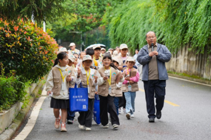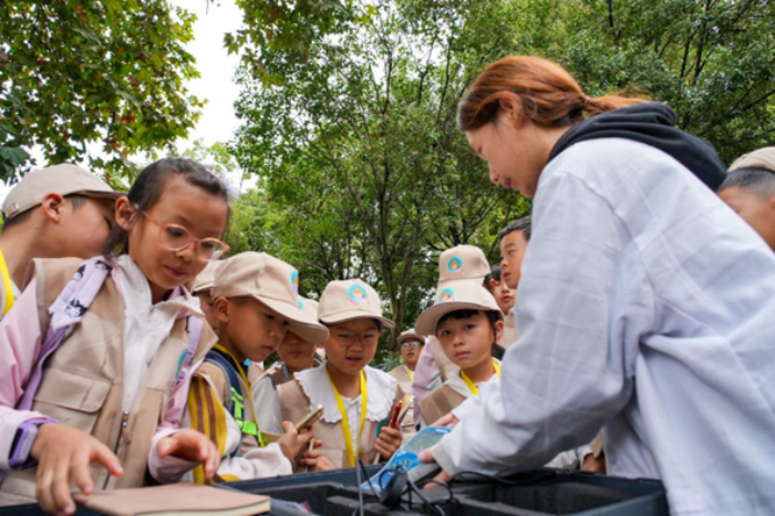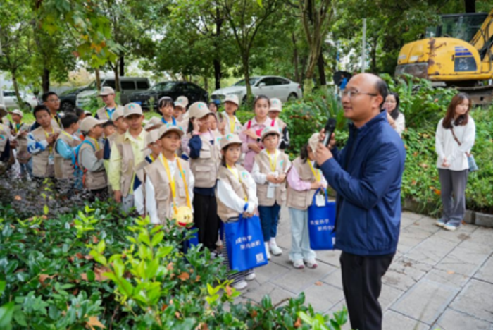 活动首个环节设于校园内——人工湿地清荷园。李望军博士将这片实景湿地化为天然课堂,为小记者们系统讲解了湿地生态系统的构成——从水、土壤、空气等非生命环境,到栖息其中的植物、动物和微生物。大家在行走与观察中,亲身感知抽象生态概念如何化为可观、可感的生命图景。