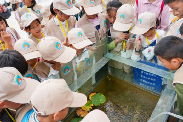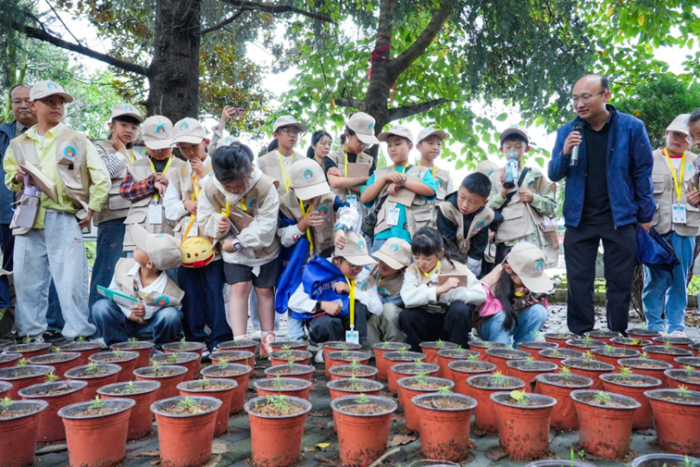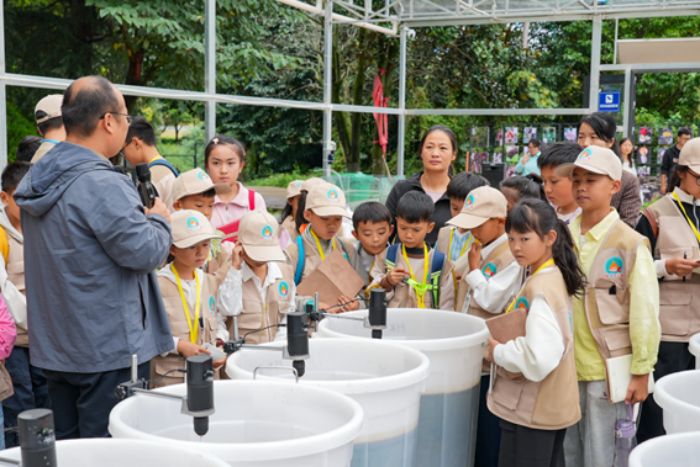 在珍稀植物保育与模拟试验场,小记者们认识了国家二级保护植物“黄杉”,详细了解其生长特性与人工培育过程。大家还现场观看了水体浑浊模拟试验,直观感受植物对悬浮泥沙的吸附作用,深化了对植物“固沙净水”生态功能的认知。