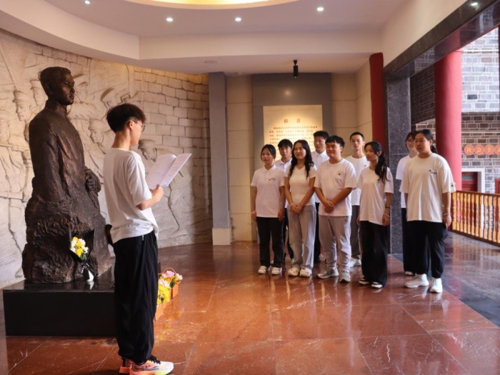 当天的纪念馆,青灰色的墙面映着晨光,周逸群烈士雕像静静矗立。全体同学整齐列队,低头肃立,向革命先烈致敬默哀。在沉静肃穆的氛围中,同学们以最真挚的情感深切缅怀这位为中国革命事业英勇献身的先驱。