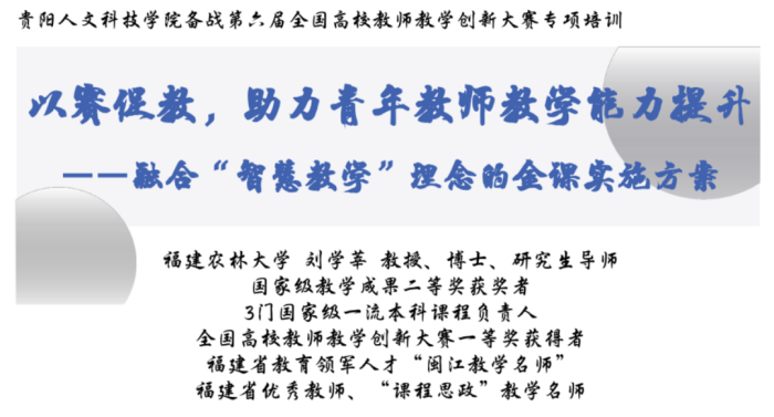 10月13日,本次工作坊正式步入收官阶段,超星贵州分公司特邀福建农林大学刘学莘教授开展“以赛促教,助力青年教师教学能力提升”专题指导。作为“闽江学者”、教学名师、国家级一流课程主持人和全国高校教师教学创新大赛一等奖获得者,刘教授在信息化教学与课程创新领域造诣深厚,不仅个人教学科研成果卓著,更指导多人在全国教学创新大赛中获奖。