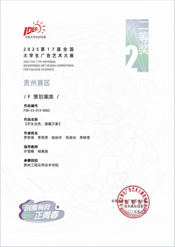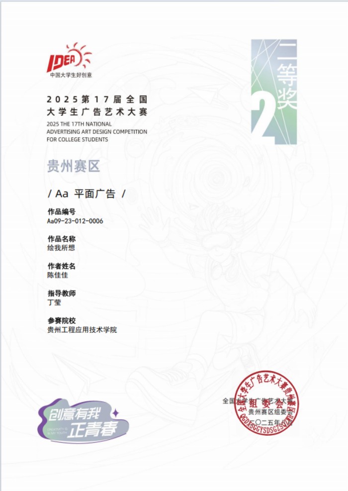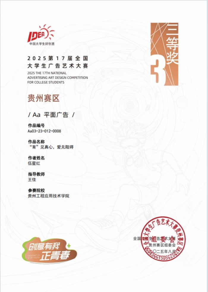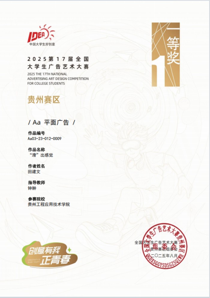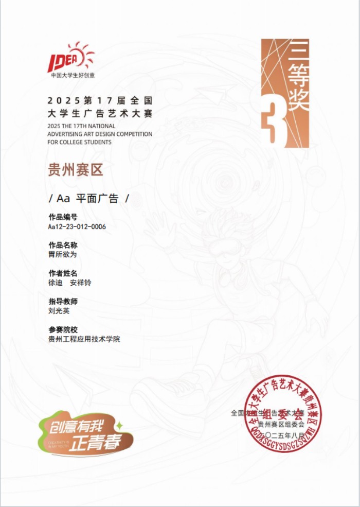 近日,2025年第17届全国大学生广告艺术大赛贵州赛区获奖名单已经公布。在贵州省级决赛中,由艺术学院、人文学院代表贵州工程应用技术学院参赛的作品荣获一等奖4个、二等奖3个、三等奖6个。同时,艺术学院钟翀老师荣获贵州赛区“优秀指导教师”称号。