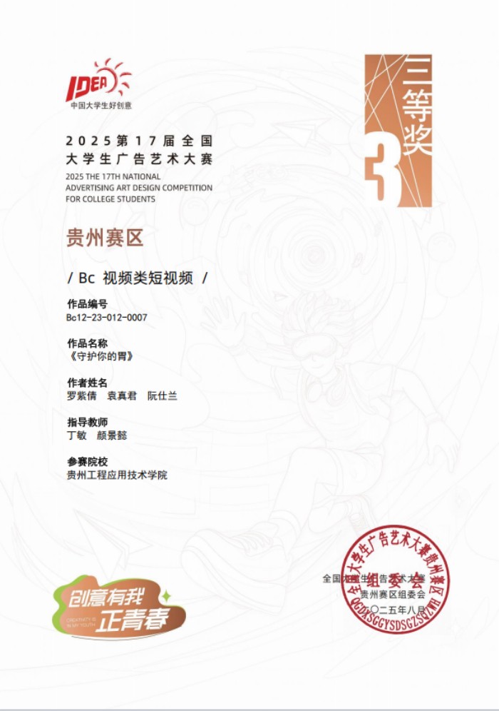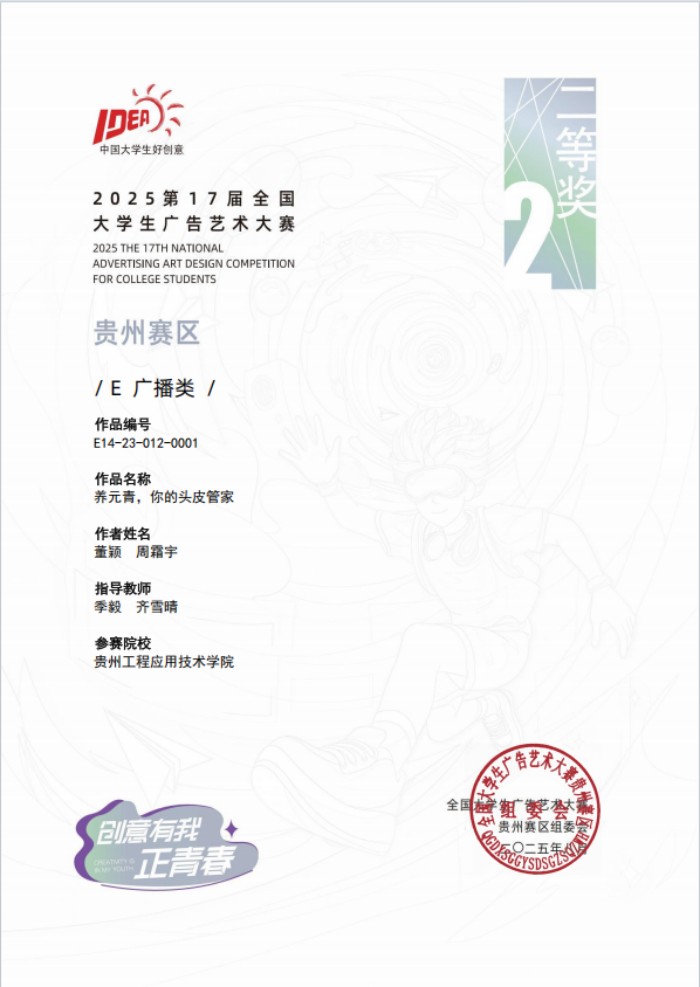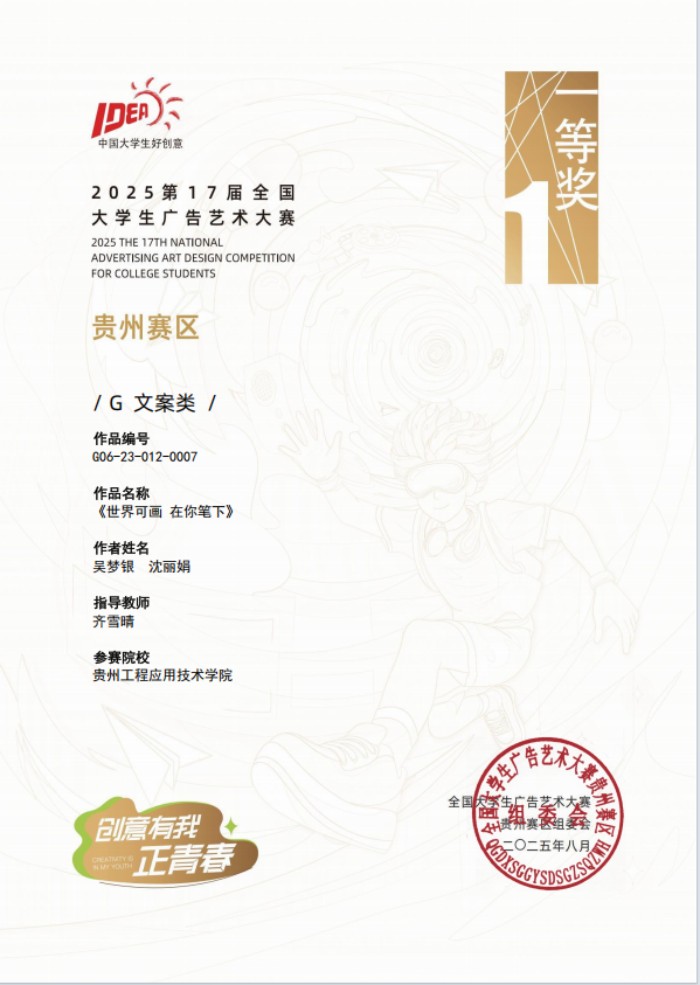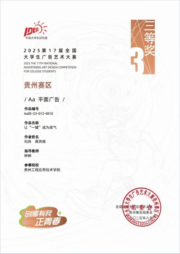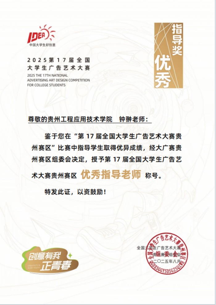 近日,2025年第17届全国大学生广告艺术大赛贵州赛区获奖名单已经公布。在贵州省级决赛中,由艺术学院、人文学院代表贵州工程应用技术学院参赛的作品荣获一等奖4个、二等奖3个、三等奖6个。同时,艺术学院钟翀老师荣获贵州赛区“优秀指导教师”称号。