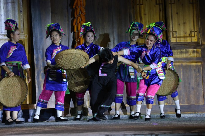 晚霞归隐山林,肇兴侗寨的夜晚却被热情的篝火点亮。贵州师范大学研学实践队的师生与身着盛装的侗族乡亲们相视而笑,手心相贴,自然而然地围成一个不断扩大的同心圆。应和着音乐的节拍,脚步声与大地共鸣。围着篝火,一位侗族小伙细心纠正着大学生的手势,教他们如何随着歌声轻轻摆动;原本坐在外围观望的游客们也情不自禁地加入舞群,各个年龄的人们大手拉着小手,欢声笑语随着袅袅炊烟升腾。年轻学子的稚嫩舞步与侗族乡亲的熟练步调在磨合中渐趋和谐,一圈又一圈,恰如文明长河中文化传承的“年轮”,记录着文化的传承与交融。侗族大歌的悠扬与群众情绪的高涨在夜空下交汇,文化在共舞与共唱中实现深度融合。