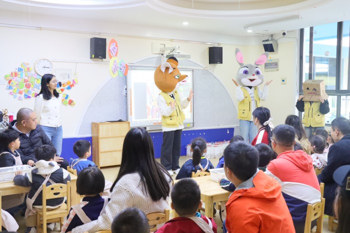 活动伊始,志愿者们化身“卡通玩偶伙伴”率先登场,穿着鲜亮服饰穿梭在孩子们中间,时而弯腰击掌,时而摆出俏皮造型,用活泼的身影快速点燃现场氛围,为后续的健康主题互动做好铺垫。