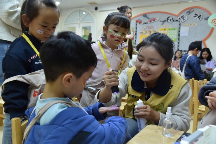 活动核心环节中,志愿者们紧密配合特邀讲师,以“玩中学”为核心开展互动:先是手持安全颜料,围绕“健康”主题为孩子绘制牙齿笑脸、水滴小天使等彩绘,悄然传递整洁理念;随后在洗护教学中,提前按组摆好牙刷漱口杯,待讲师示范时,蹲身逐人纠正孩子刷牙姿势,教完洗手还细心涂抹润肤霜;水果创意环节,志愿者们提前备妥切好的水果,检查分发安全工具,陪着孩子拼出创意拼盘。孩子们或举着小镜子欣赏彩绘、或认真模仿刷牙动作、或兴奋地展示水果作品,志愿者们则始终弯腰相伴、微笑引导,整个环节既充实有序,又充满童真暖意。