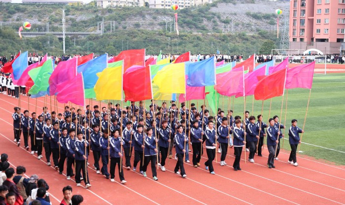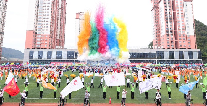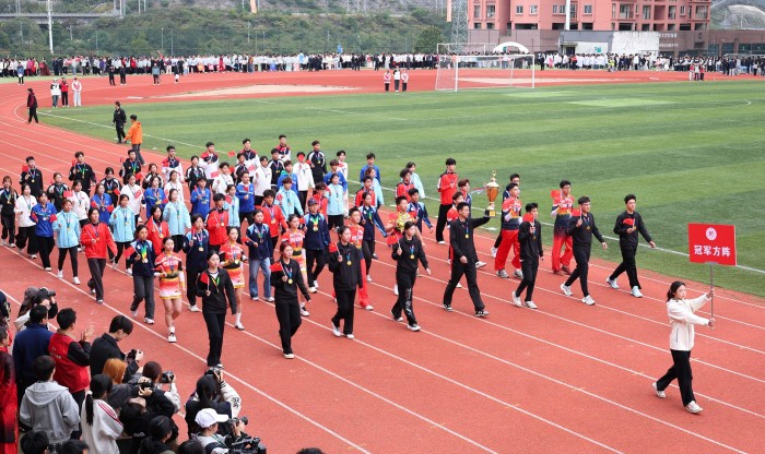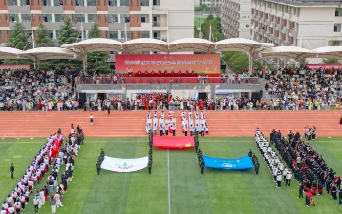 仪仗方队、彩旗方队、冠军方队、裁判员方队及各学院方队依次入场,青春气息与热烈氛围扑面而来。文艺表演分 “铭记历史传薪火”“体育强国展风采”“闪亮青春铸师魂” 三篇章精彩呈现。《龙腾狮跃启新程》拉开序幕,表演者身姿矫健、演绎灵动,舞出青春朝气与奋进豪情;合唱舞蹈《黄河大合唱》旋律雄浑、演绎震撼,彰显中华儿女铭记历史的坚定意志;朗诵《贵州放歌》饱含深情,诉说黔中大地沧桑巨变与蓬勃生机;《绳操律动》中,学子们动作整齐、身姿飒爽,融体育活力与韵律之美;《武道群英》一招一式刚劲有力,尽显体育强国青春风采;《青春时代》啦啦操节奏动感、姿态热情,展现学子自信昂扬面貌;《师道之光》歌舞舞姿优美、歌声动人,诠释师者立德树人的崇高精神。演出在《挺拔的香樟》歌声中落下帷幕,全体演员齐聚舞台,意蕴深长、催人奋进。