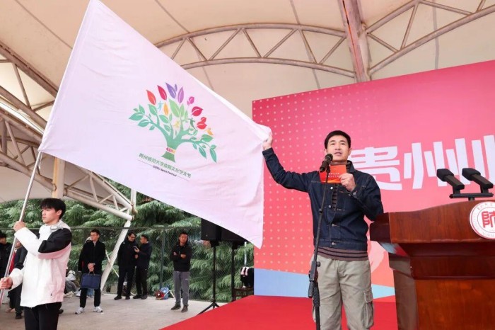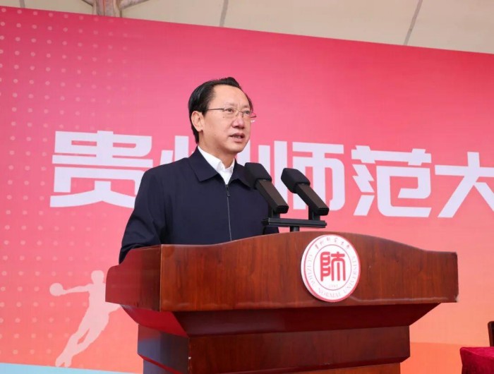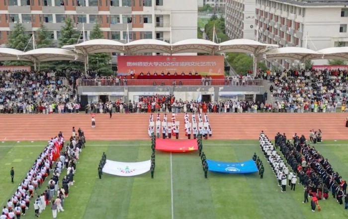 张绍东在致辞中向筹办师生致谢,向全体参与者致以问候。他指出,2025年作为体育强国建设关键之年,本次艺术节是学校践行“五育并举”教育方针的重要实践,更是师生彰显活力、锤炼素养的广阔舞台。此前,贵州师范大学代表团在贵州省第六届学生运动会中斩获54金40银18铜,打破10项赛会纪录,勇夺5个团体总分冠军,尽显强劲竞技实力与拼搏精神。他强调,学校始终深耕校园文体建设,通过篮球赛、健身跑等多元活动厚植文体氛围,他期望全体师生以此次艺术节为契机,在运动中强健体魄,在协作中凝聚合力,为学校建设区域高水平大学注入澎湃动能。