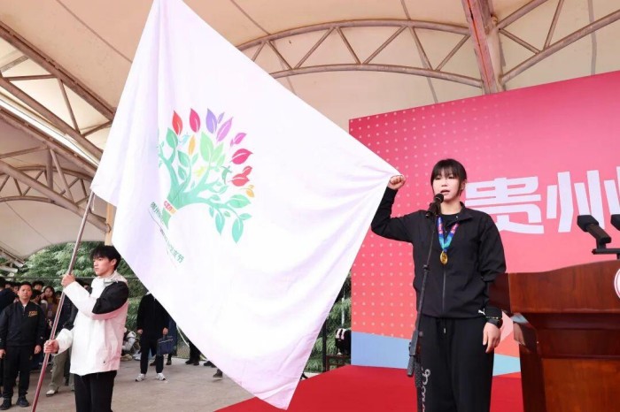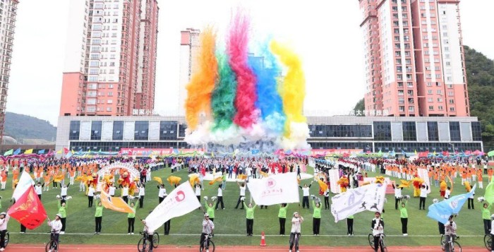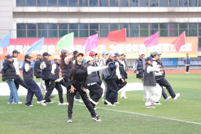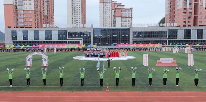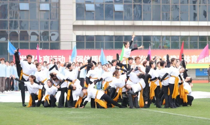 仪仗方队、彩旗方队、冠军方队、裁判员方队及各学院方队依次入场,青春气息与热烈氛围扑面而来。文艺表演分 “铭记历史传薪火”“体育强国展风采”“闪亮青春铸师魂” 三篇章精彩呈现。《龙腾狮跃启新程》拉开序幕,表演者身姿矫健、演绎灵动,舞出青春朝气与奋进豪情;合唱舞蹈《黄河大合唱》旋律雄浑、演绎震撼,彰显中华儿女铭记历史的坚定意志;朗诵《贵州放歌》饱含深情,诉说黔中大地沧桑巨变与蓬勃生机;《绳操律动》中,学子们动作整齐、身姿飒爽,融体育活力与韵律之美;《武道群英》一招一式刚劲有力,尽显体育强国青春风采;《青春时代》啦啦操节奏动感、姿态热情,展现学子自信昂扬面貌;《师道之光》歌舞舞姿优美、歌声动人,诠释师者立德树人的崇高精神。演出在《挺拔的香樟》歌声中落下帷幕。