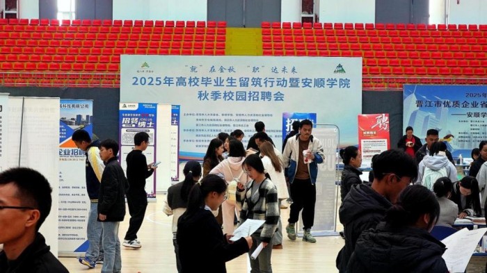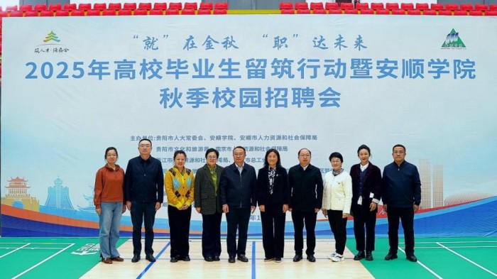 2025年10月28日,安顺学院隆重举办了主题为“‘就’在金秋 ‘职’达未来”的2025年高校毕业生留筑行动暨安顺学院秋季校园招聘会。本次招聘会由贵阳市人大常委会、安顺学院、安顺市人力资源和社会保障局、南京市人力资源和社会保障局、晋江市人力资源和社会保障局联合主办。活动当天,贵阳市人大常委会副主任、副主任王启云,安顺学院院长曾丽,安顺学院党委常委、副校长孙向阳出席招聘会现场,并与用人企业、求职学生深入交流,详细了解企业招聘情况和学生应聘需求。