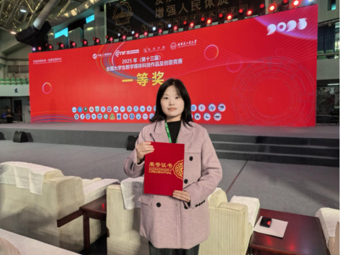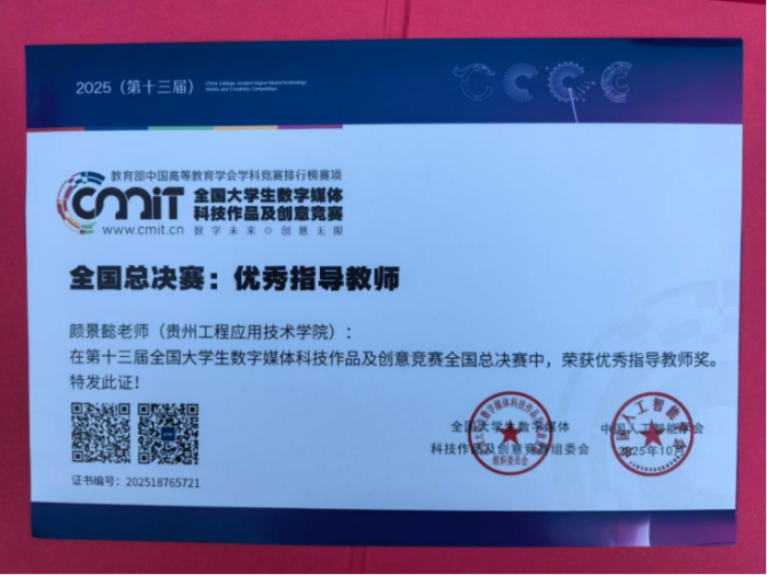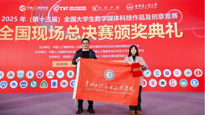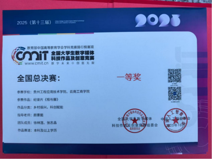 10月25日上午9时,由中国人工智能学会等主办的全国普通高校大学生A类竞赛——2025年全国大学生数字媒体科技作品及创意竞赛全国总决赛及颁奖典礼在哈尔滨工业大学举行。由贵州工程应用技术学院人文学院颜景懿老师指导的纪录片《根与藤》表现突出,从1900 余项入围国赛的作品中强势突围,成功斩获全国总决赛一等奖,颜景懿老师也凭借专业的指导能力荣获“优秀指导老师”荣誉称号。