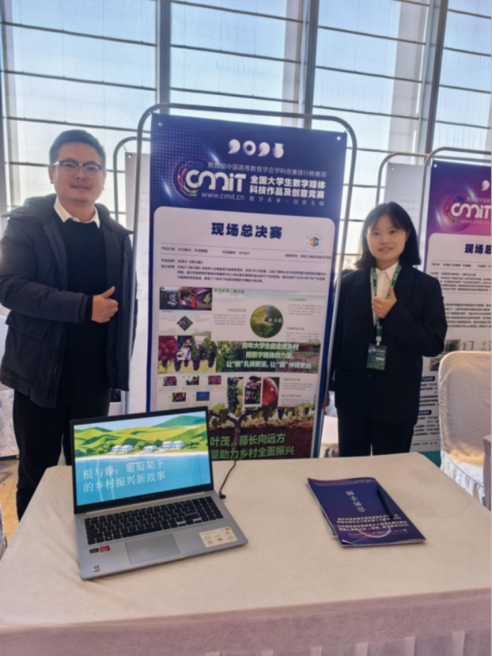 纪录片《根与藤》的创作历经18个月。作品通过深度挖掘当地葡萄种植果农在种植过程中遭遇的实际困境,真实呈现了乡村小农户在产业发展中面临的现实挑战,并生动展现了个体农户面对困境时坚韧不拔、不懈奋斗的精神内核,兼具现实意义与人文温度。在全国总决赛答辩环节,徐林莲同学凭借扎实的专业基础、活跃的创新思维和良好的综合素养赢得了评委的一致认可,这一表现也生动诠释了人文学院“能教能创,善作善成”的应用型人才培养特色。