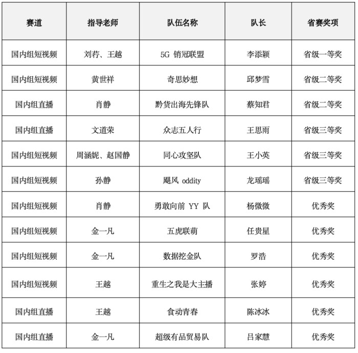 贵州医科大学参赛队伍展现了强劲的实力与良好的精神风貌。在国内组短视频赛道中,由刘荇、王越老师指导,李添颖同学担任队长的“5G 销冠联盟”队荣获省级一等奖;由黄世祥老师指导,邱梦雪同学担任队长的“奇思妙想”队荣获省级二等奖;由周涵妮、赵国静老师指导,王小英同学担任队长的“同心攻坚队”和由孙静老师指导,龙瑶瑶同学担任队长的“飓风 oddity”队获省级三等奖。在国内组直播赛道中,由肖静老师指导,蔡知君同学担任队长的“黔货出海先锋队”获省级二等奖;由文道荣老师指导,王思雨同学担任队长的“众志五人行”,获省级三等奖。