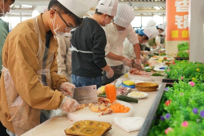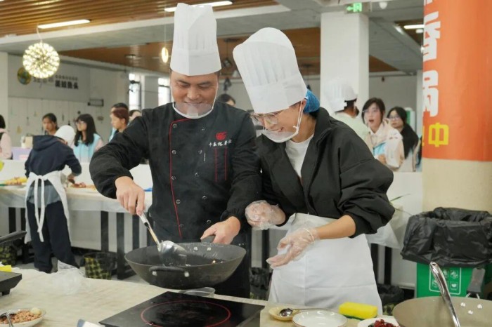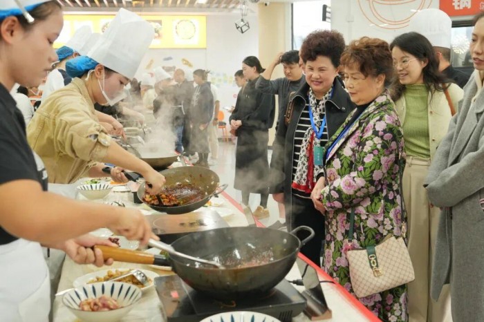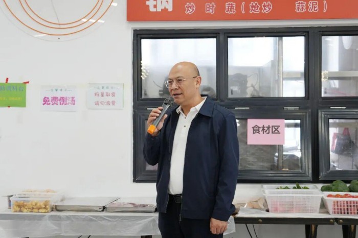 校党委副书记于浩现场观摩指导。寄语同学们“劳动是成长的必修课,厨房虽小,却是锤炼本领、展示风采的大舞台,希望同学们能在烹饪的过程中感受劳动的温度,增长劳动技能。”亲切的话语让现场选手备受鼓舞,大家纷纷表示将以更饱满的热情投入比赛。