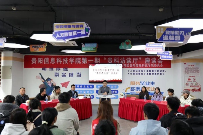 11月4日,贵阳信息科技学院团委在学生事务中心举办“贵科访谈厅”第一期座谈会,团委副书记(主持工作)罗一檾主持活动,校后勤处处长马中平、保卫处处长冉小旭、信息中心(现代教育中心)主任崔云飞、资产管理处老师蒲松运与58名学生代表齐聚一堂,以“倾听学生心声、聚焦校园痛点、推动问题整改”为目标,现场回应学生诉求,解决学生反映的各类校园问题。