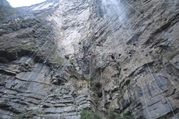 本次赛事的竞赛场地——七星山绝壁,以90度垂直形态屹立山间,400米长的竞赛绳索从悬崖顶端凌空垂落,垂直落差相当于130层高楼,对选手的体能、技术与心理素质均提出极高要求。