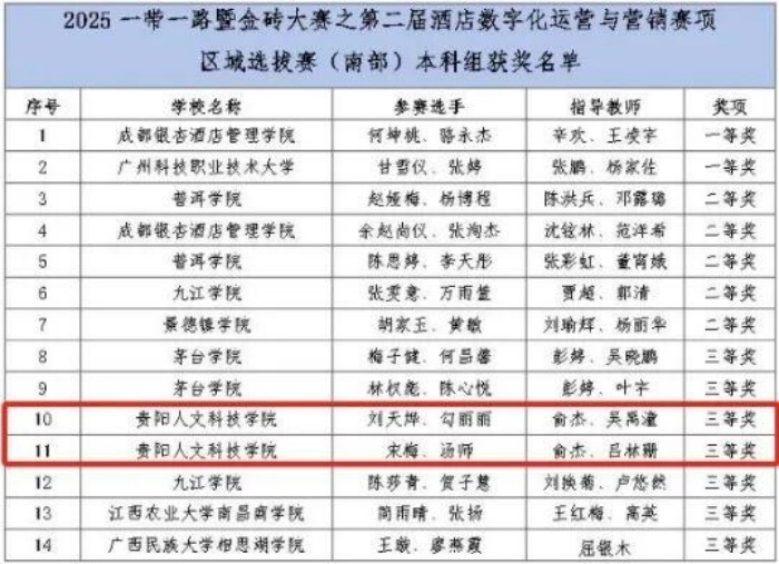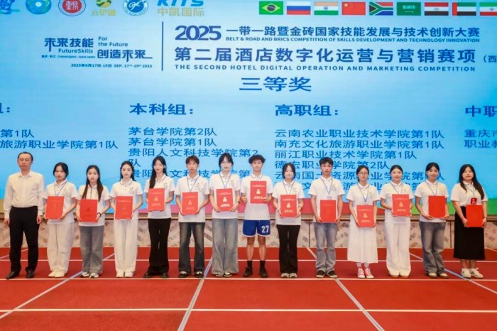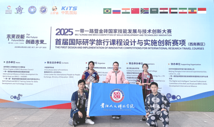 近日,2025“一带一路”暨金砖国家技能发展与技术创新大赛圆满落幕,贵阳人文科技学院文化旅游与区域发展学院师生凭借出色与扎实的赛场表现,在第二届酒店数字化运营与营销赛项(西南赛区)、首届国际研学旅行课程设计与实施创新赛项中分别获得三等奖二项与优秀奖一项,其中2支队伍晋级国赛。