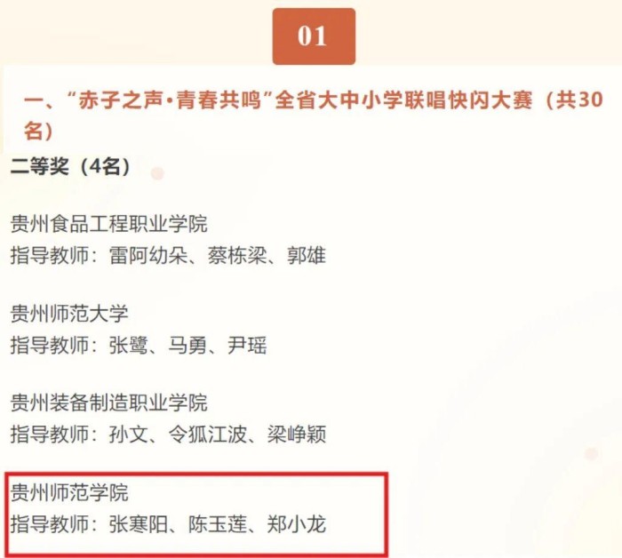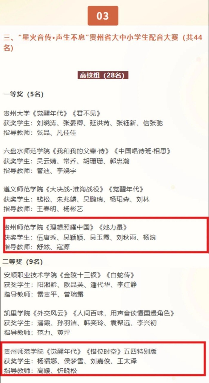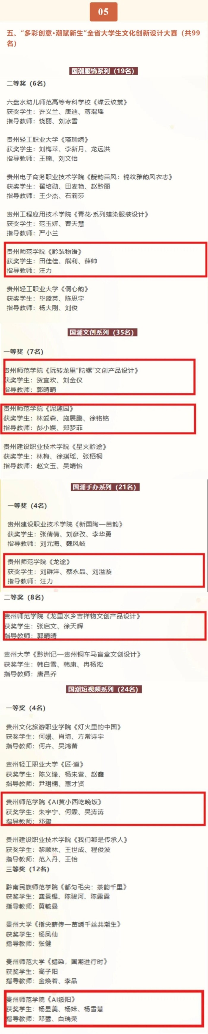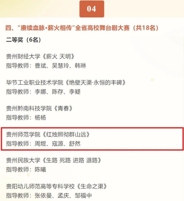 近日,由贵州省委教育工委、省委宣传部、省教育厅、省精神文明办、省委网信办、团省委联合举办的第二十届“多彩校园·闪亮青春”全省校园文化活动月各项比赛已全部完赛。本届校园文化活动月共产生206个奖项,贵州师范学院共获得12个奖项,分别为“赤子之声·青春共鸣”全省大中小学联唱快闪大赛二等奖、“星火音传·声生不息”贵州省大中小学生配音大赛一等奖和二等奖、“赓续血脉·薪火相传”全省高校舞台剧大赛二等奖、“多彩创意·潮赋新生”全省大学生文化创新设计大赛4个一等奖、2个二等奖和1个三等奖、二十届“多彩校园·闪亮青春”全省校园文化活动月优秀组织奖。