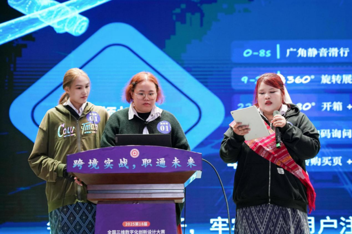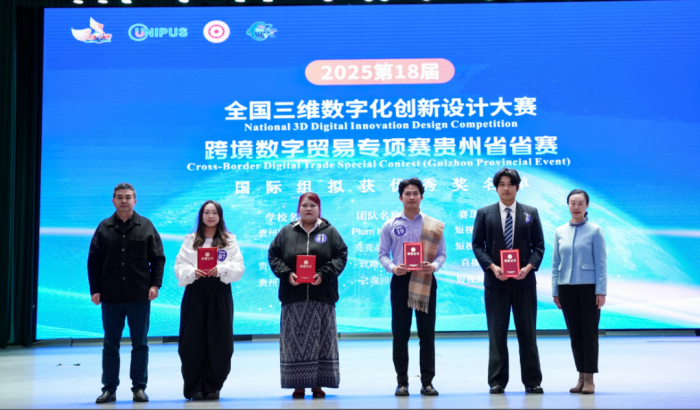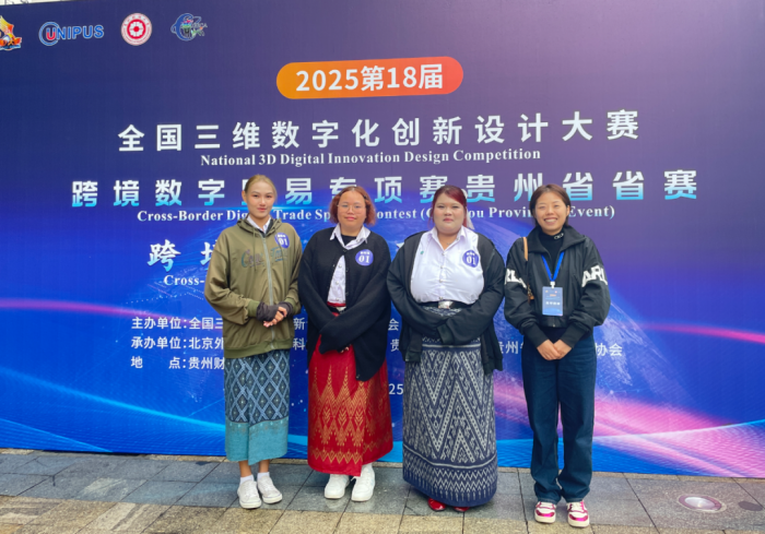 2025年10月25日,在经济管理学院徐爽老师、黄咏梅副书记的指导下,贵阳学院经济管理学院23级同学贺俊杰、李佳静携手泰国加拉信大学交换生杨逸飞(KHOPUENGKLANG TIPLADA)、李爱丽(SAMRANRUEN THANCHANOK)、曹敏(KANRSAUY ANGKANA)共同组队,参加由贵州财经大学承办的全国三维数字化创新设计大赛跨境数字贸易专项赛,获得贵州赛区二等奖,并获得晋级国赛资格。