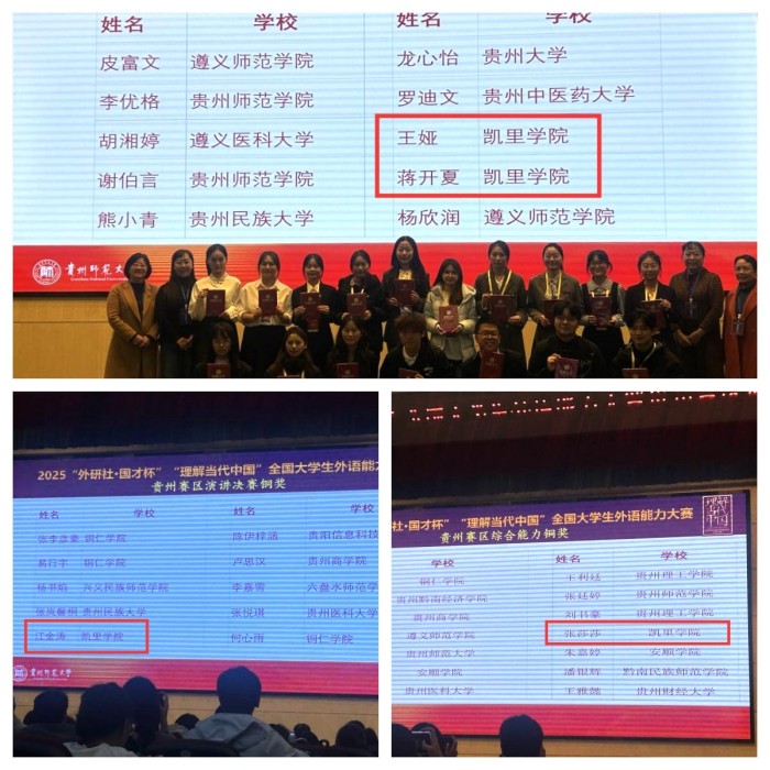 “外研社·国才杯”“理解当代中国”全国大学生外语能力比赛是外语学科领域最具影响力的国家级赛事之一。凯里学院学子以专业实力与家国情怀,充分展示了新时代青年外语学习者的风采,彰显了学校立德树人、学科育人的成效。